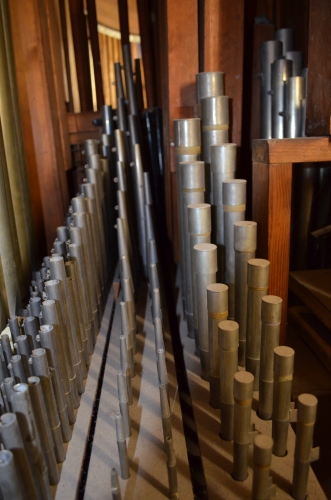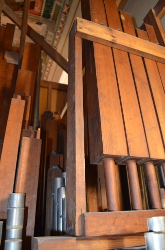 Bordun 8' und Feinflöte 4' (Im Bordun 8' tragen viele Pfeifen die Aufschrift Bordun 16', in der Feinflöte 4' wurden Pfeifen von Voix celeste 8' verarbeitet)
