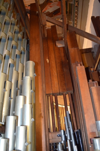 Bordun 8' und Feinflöte 4' (Im Bordun 8' tragen viele Pfeifen die Aufschrift Bordun 16', in der Feinflöte 4' wurden Pfeifen von Voix celeste 8' verarbeitet)